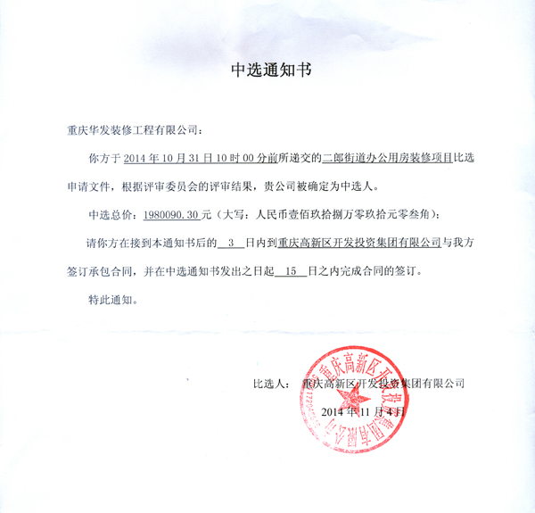 經過公開招標及評審委員會的評審結果,我司被確定為中標候選人。于2014年11月10日,我司與重慶高新區(qū)開發(fā)投資集團有限公司成功簽訂二郎街道辦公室裝修工程。