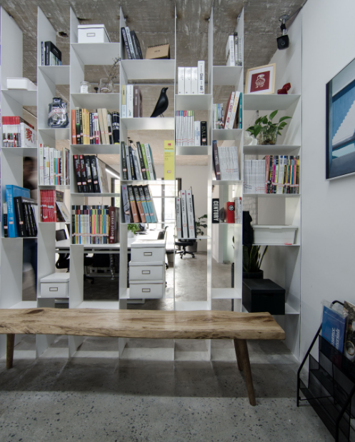 2、書架用金屬材料連著天花板,又能起隔斷作用,還能放裝飾品和書籍,簡單又實用。