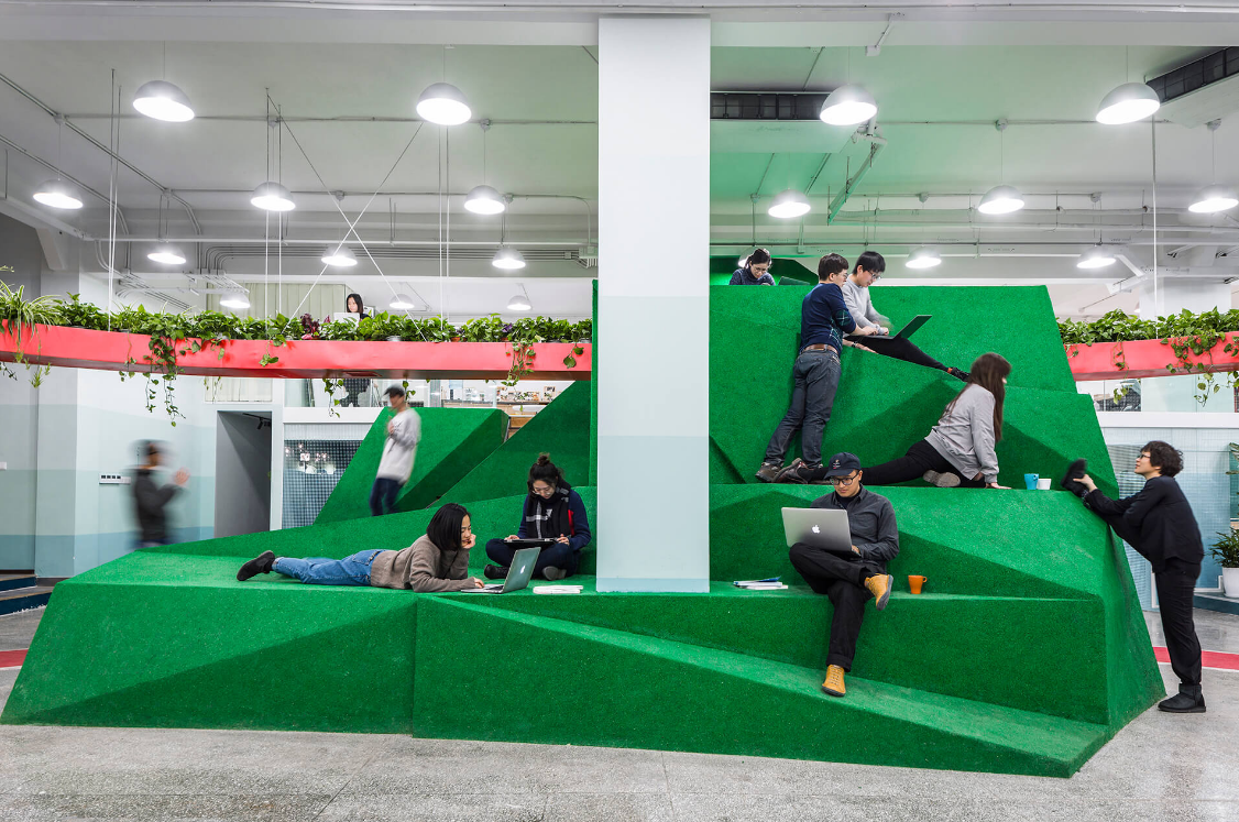 結合休閑和工作,內部有一座'迷你山'。幾何表面為各種坐姿和休息姿勢提供良好的舒適感,并提供通往夾層的通道。有趣的是,墻上的圖形旨在提醒員工保持積極和不斷變化的工作姿勢。漸變的藍色柱子以60厘米為單位涂刷,其中在每個高度上對應了不同的姿勢和活動,如坐,走,躺,攀爬等等。