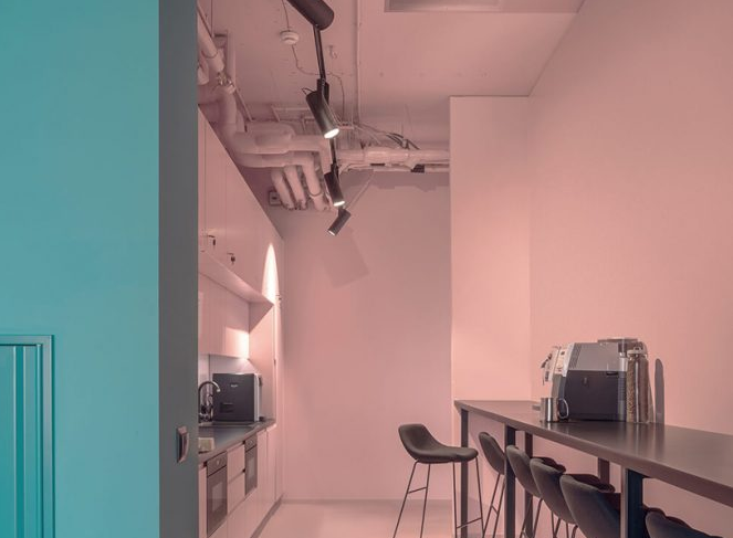 辦公室裝修采用的噴霧泡沫天花板和聲學(xué)面板墻被用來減輕聲音的傳輸和保持聲學(xué)的舒適性。而不是解決這與一般的聲學(xué)天花板瓷磚或擋板,聲學(xué)處理被整合為空間室內(nèi)設(shè)計(jì)的一部分。辦公室裝修的隔音墻板采用條紋浮雕圖案,為內(nèi)墻飾面提供尺度和節(jié)奏感,而辦公室裝修的天花板則采用整體方式,在某些情況下覆蓋所有機(jī)械設(shè)備,將它們變成懸掛的抽象物體,通常會(huì)被通用下降的天花板系統(tǒng)所掩蓋。