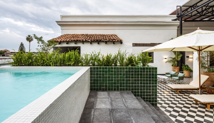 酒店裝修翻新的屋頂露臺,同時擁有一個酒吧與蔚藍家具和戶外游泳池與Tlaquepaque的著名教堂穹頂的前景。